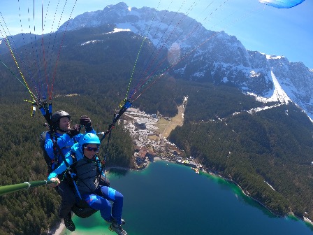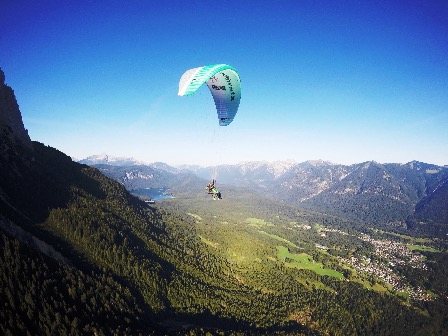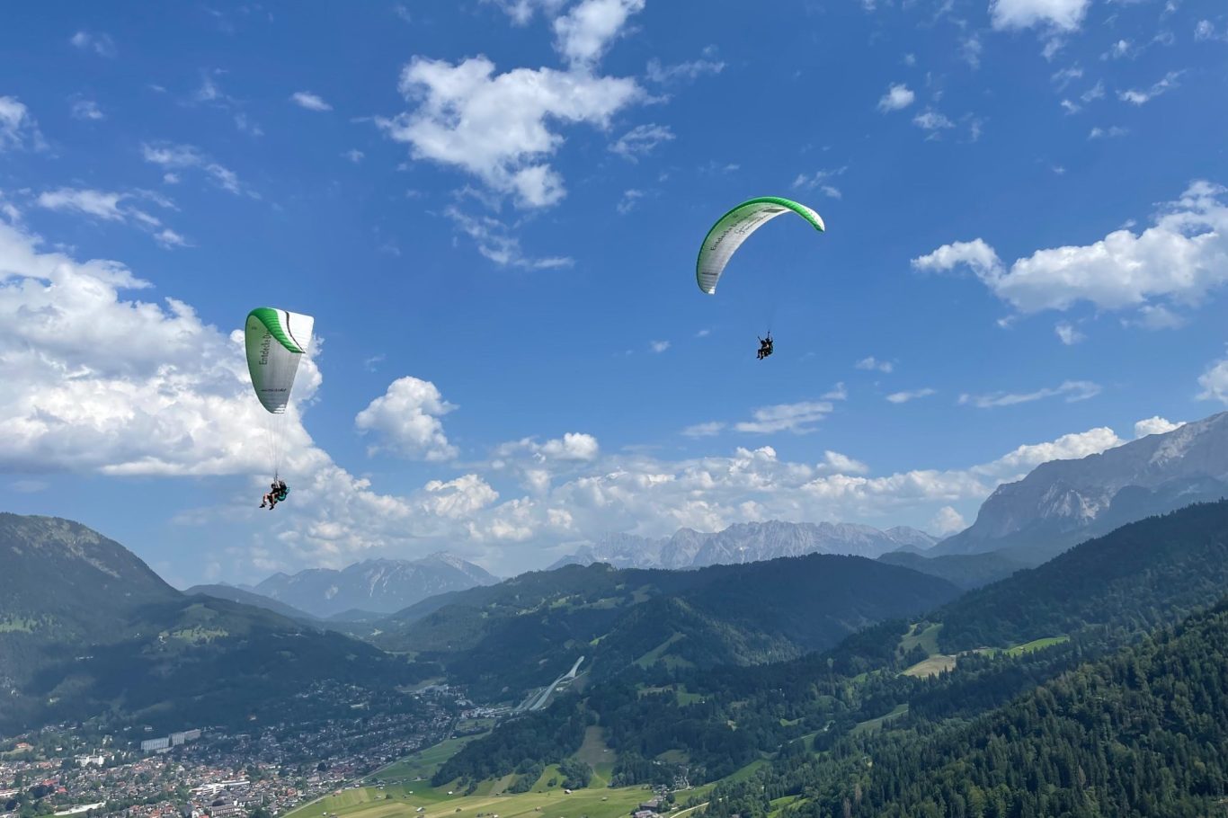 Kreise als Passagier mit einem Tandem Gleitschirm, wie ein Adler in der Bergwelt hoch über Garmisch-Partenkirchen vor dem traumhaften Bergpanorama der Zugspitze und Alpspitze! Erfülle Dir den Traum vom Fliegen und der Freiheit, die nur am Himmel erlebt werden kann.